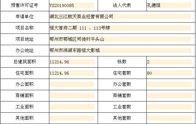 预售许可证号:YS20190085 湖北三江航天商业经营有限公司-恒大首府二期111、113号楼