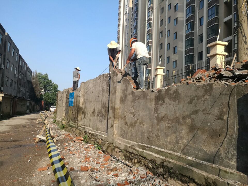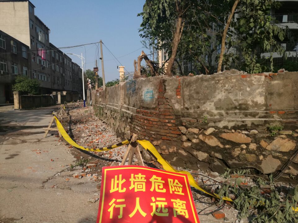 7月7日,凤凰街办求援,凤凰街办菜园头村4组卫家湾进出道路两边的危墙急需拆除。为消除危墙安全隐患,市建委与市地震局等相关单位取得联系,经多方研究,最后责成由水木清华物业管理公司组织施工队伍负责拆除两段围墙,7月7日该公司人工拆除了部分危险墙面, 8日,又安排施工队和大型机械进场作业,拆除了共计近700米的全部危墙,受到了附近居民的交口称赞。